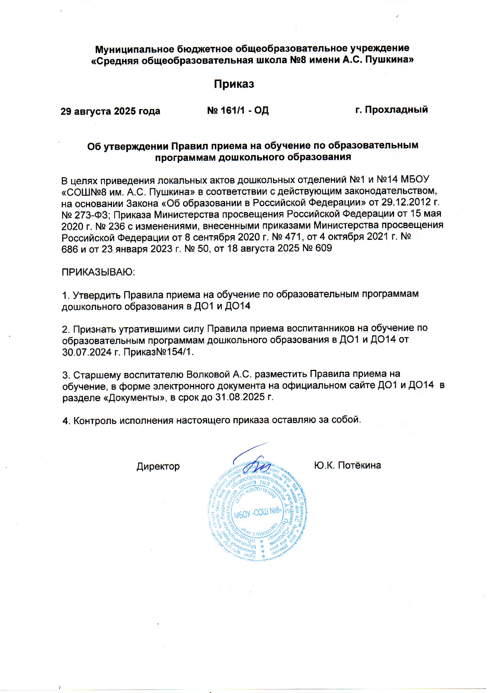 Приказ об утверждений Правил приема на обучение по образовательным программам ДО